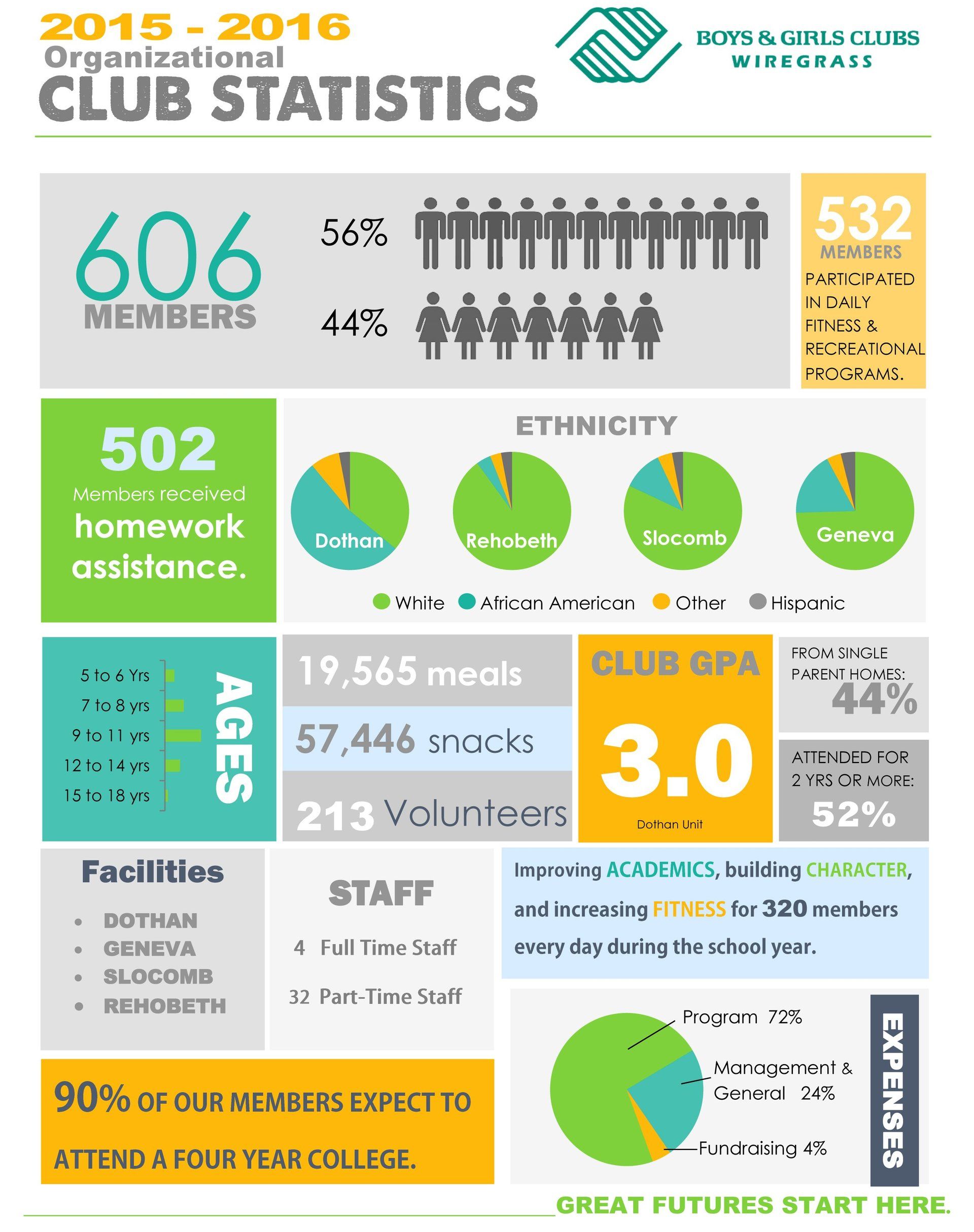 The Boys Club of Dothan was established in 1959 and chartered in 1961. In 1990, the Boys Clubs officially became known as the Boys & Girls Clubs of America. Presently, the Boys & Girls Clubs of the Wiregrass serve nearly 350 boys and girls on a daily basis with a total annual program membership surpassing 600 youth.